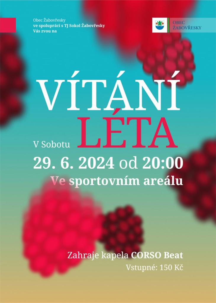 Obec Žabovřesky srdečně zve na "VÍTÁNÍ LÉTA" v sobotu 29.6.2024 od 20:00 na fotbalovém hřišti.